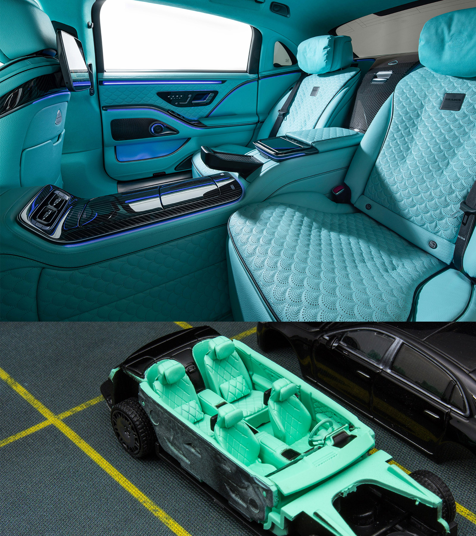 兼顾奢华和运动气质的博速850,内饰采用了夺目的蓝绿色与碳纤维面板的组合,因此我们特意在中控台表达了碳纤维质感。