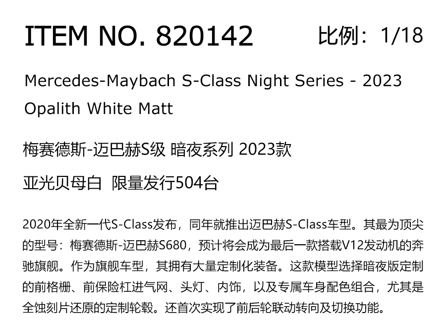 / 梅赛德斯-迈巴赫S级 暗夜系列 2023款 亚光贝母白 1/18