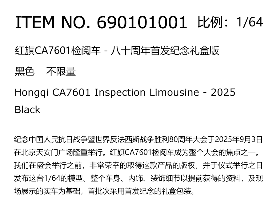 / 红旗CA7601检阅车 - 抗战胜利八十周年纪念版 1/64